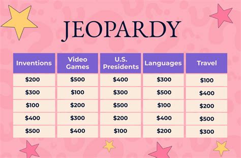 Easy Jeopardy Template - The process to design a customized jeopardy template. Easy to use and customize for your presentations. Host your very own jeopardy game using these free jeopardy templates. Create your own jeopardy game questions. Our first free printable jeopardy template, featuring an elegant baby pink theme and spanning across a wide area of a 5×6 grid, gives you all the freedom.