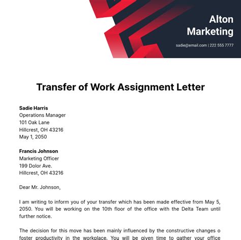 Request Letter For Transfer Of Work Assignment - In this article, we list steps on how to write a request letter for a transfer, discuss common reasons for making such a request,. If you need to request a transfer in writing, write a letter highlighting why you're making the request. Write a formal transfer request letter explaining why you wish to move to another position, department, or branch..